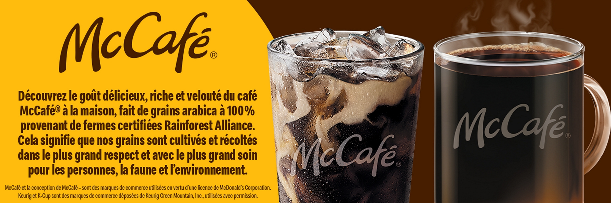 Découvrez le goût délicieux, riche et velouté du café McCaféMD à la maison, fait de grains arabica à 100 % provenant de fermes certifiées Rainforest Alliance. Cela signifie que nos grains sont cultivés et récoltés dans le plus grand respect et avec le plus grand soin pour les personnes, la faune et l’environnement. McCafé et la conception de McCafé sont des marques de commerce utilisées en vertu d’une licence de McDonald’s Corporation. KeurigMD et K-CupMD sont des marques de commerce déposées de Keurig Green Mountain, Inc., utilisées avec permission.